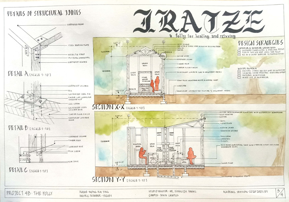 The folly I designed is IRATZE which brings a meaning of healing. Nowadays, I realised that many of us will get depressed or down due to daily stress and not able to express it out, consequently, it will lead to mental illness or disorder. Get inspired by IRATZE, I decide to design a folly which can help students or anyone in USM to heal from any mental problems or stress and get relaxed.